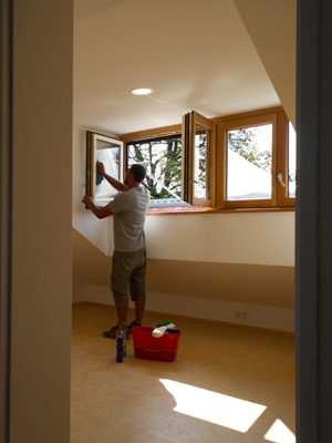 Im Dachgeschoß entstehen 2 Kinderzimmer, jeweils mit einer großen Dachgaube versehen, sowie ein Bad mit Giebelfenster. Da das existierende Dachtragwerk für einen Ausbau ungeeignet ist - die Pfetten befinden sich in Kopfhöhe - muss das Dach komplett abgetragen und neu erstellt werden. Stahlpfetten in der Ebene der Dachsparren erlauben jetzt Kopffreiheit. Die Dachgauben sind aus Holz und mit Flachdächern versehen, um oberhalb der Süd-Gaube genügend Platz für die bereits existierenden Solarthermie-Module zu belassen. Durch den Einbau einer Flächenheizung in Form eines Heizestrichs kann im Dachgeschoß auf Heizkörper verzichtet werden. Da das Haus während der Bauphase bewohnt bleibt, ist für den Zeitraum der Demontage und Neuerrichtung des Daches ein Wetterschutzdach nötig. Ein separater Baustellenzugang über das Gerüst, sowie eine provisorische Decke im Treppenhaus schützt die Bewohner vor Staub und Lärm.